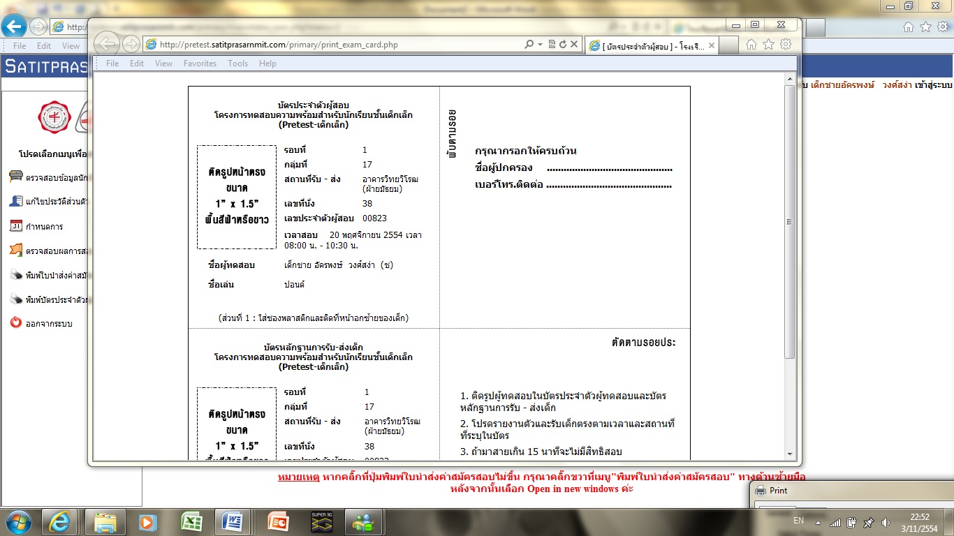 หมายเหตุ: หากกดที่ปุ่ม “พิมพ์บัตรประจำตัวผู้สอบ” แล้วบัตรประจำตัวสอบไม่แสดง