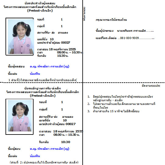 4. จากนั้นพิมพ์บัตรประจำตัวผู้สอบ ติดรูปถ่ายหน้าตรงเห็นหน้านักเรียนชัดเจนขนาด 1*1.5 นิ้ว ถ่ายไว้ไม่เกิน 6 เดือน จำนวน 2 รูป โดยเป็นรูปสีหรือ ขาวดำ พื้นหลังสีฟ้าหรือขาว ติดบน บัตรประจำตัวผู้สอบ และ บัตรหลักฐานการรับ -ส่งเด็ก ซึ่งทั้ง 2 ส่วนจะต้องนำมาแสดงในวันสอบ โดยผู้ปกครองของ ผู้สอบจะได้รับบัตรหลักฐานการรับ -ส่งเด็ก คืน เพื่อนำมายืนยันในการรับผู้สอบกลับ